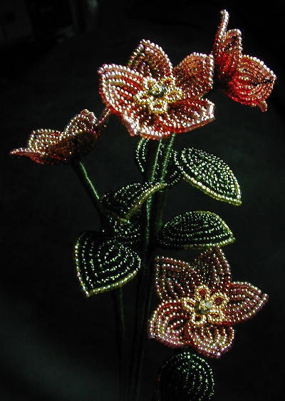 | Beads finished in a rich gold lustre retain the warm red glow from within. Tiny 24 karat gold finished beads and a flower shaped Swarovski crystal adorn the center of each flower giving simple this stylized poppy an elegant look. | |||||